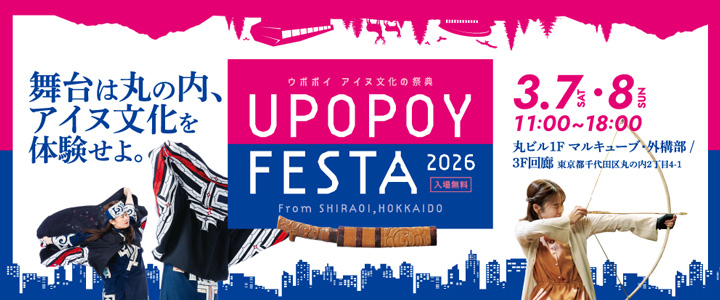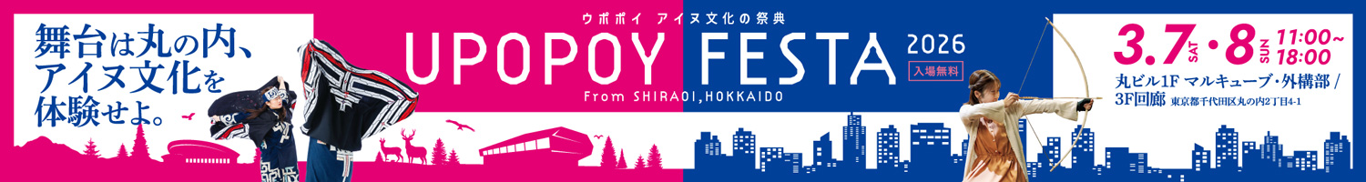 重要なお知らせ 2026年2月15日 システム入替作業に伴う事前予約取り扱いの変更について【2/15~3/31】... 2026年1月9日 2026年2月28日(土)~3月9日(月)の冬季閉園について... 11月3日(木・文化の日)は無料開放日です。詳しくはこちら 「博物館入館整理券」取得※ウポポイ入場にあたり予約は必要ありません。 ※学校利用などにより混雑することがございますので、博物館入館整理券の事前予約を推奨しております。 ウポポイ周辺の天気 今日 | 3/4 水 雪 1°C ウポポイを堪能するおすすめコース はじめてのウポポイコース Upopoy Visitor guide 詳細はこちら ファミリーコース Upopoy Visitor guide 詳細はこちら アイヌ文化深掘りコース Upopoy Visitor guide 詳細はこちら アイヌの世界探訪コース Upopoy Visitor guide 詳細はこちら 今日 | 3/4 水 本日は閉園日です 新着ウポポイトピックス 博物館 【関連イベント】第10回テーマ展示「ケレ ヤン、ヌカㇻ ヤン、ヌ ヤン さわる、みる、きく 国立アイヌ民族博物館 2」 2026年2月27日 「ウポポイ・白老・登別フォトコンテスト2025」受賞結果発表 2026年2月26日 博物館 ホリデーイベントのご案内(2026年2月分) 2026年2月22日 イベント 2026 AINU台湾公演 2026年2月19日 プログラム 口承文芸特別実演「ネウサㇻアン ロ」【第8回】 2026年2月16日 イベント トナカイがやってくる! 2026年1月26日 博物館 ギャラリートークのご案内(2026年2月、3月分) 2026年1月21日 イベント ウケㇱコㇿ~紡がれるアイヌ伝統芸能と歌舞伎~【観覧受付終了】【パブリックビューイングのご案内】 2025年12月19日 ウポポイトピックス一覧 イベントカレンダー(随時更新) 2026年 3月日月火水木金土1234567891011121314トゥレッポんのおさんぽ15161718192021トゥレッポんのおさんぽギャラリートークトゥレッポんのおさんぽギャラリートーク22232425262728トゥレッポんのおさんぽトゥレッポんのおさんぽ2930311234トゥレッポんのおさんぽギャラリートーク 2026年 4月日月火水木金土2930311234トゥレッポんのおさんぽギャラリートーク5678910111213141516171819202122232425262728293012 9:00〜18:009:00〜20:009:00〜17:00閉園日未定 年間カレンダーはこちら ウポポイとは プログラム一覧 グルメ ショッピング アイヌ民族博物館 慰霊施設 ウポポイ(民族共生象徴空間ウアイヌコㇿ コタン)園内MAP カンカン いざないの回廊 ウウェランカラㇷ゚ ミンタㇻ 歓迎の広場 ホㇱキアン チセ エントランス棟 アヌココㇿ アイヌ イコロマケンル 国立アイヌ民族博物館 イカㇻ ウシ 工房 テエタ カネ アン コタン 伝統的コタン ヤイハノッカㇻ チセ 体験学習館 ウエカリ チセ 体験交流ホール チキサニ ミンタㇻ チキサニ広場 ポロト湖 ウポポイをバーチャル体験! 多彩なアイヌ文化体験プログラム開催中 プログラム タイムテーブル/全施設一覧 イタㇰ トマリ@体験学習館 イメル@体験交流ホール シアタープログラム 「普段着のアイヌ」@国立アイヌ民族博物館 カムイ アイズ@体験学習館 実食体験プログラム「イペアン ロ!」@体験学習館 展示鑑賞@国立アイヌ民族博物館 プログラム一覧 お知らせ 一覧 学校会員制度「ウポポイキャンパスメンバーズ」を創設 会員校の学生・教職員はウポポイ入場料が無料に 2026年3月3日 【ウポポイ】東京カメラ部タイアップ企画「ウポポイ・白老・登別フォトコンテスト2025」入賞作品が決定! 2026年2月26日 月刊ウポポイ 3月号【No.32】 2026年3月1日 ウポポイにおける新型コロナウィルス感染者の発生について 広告欄 ウポポイウェブサイトバナー広告募集についてはこちら バナー広告募集中 Facebook Instagram Youtube