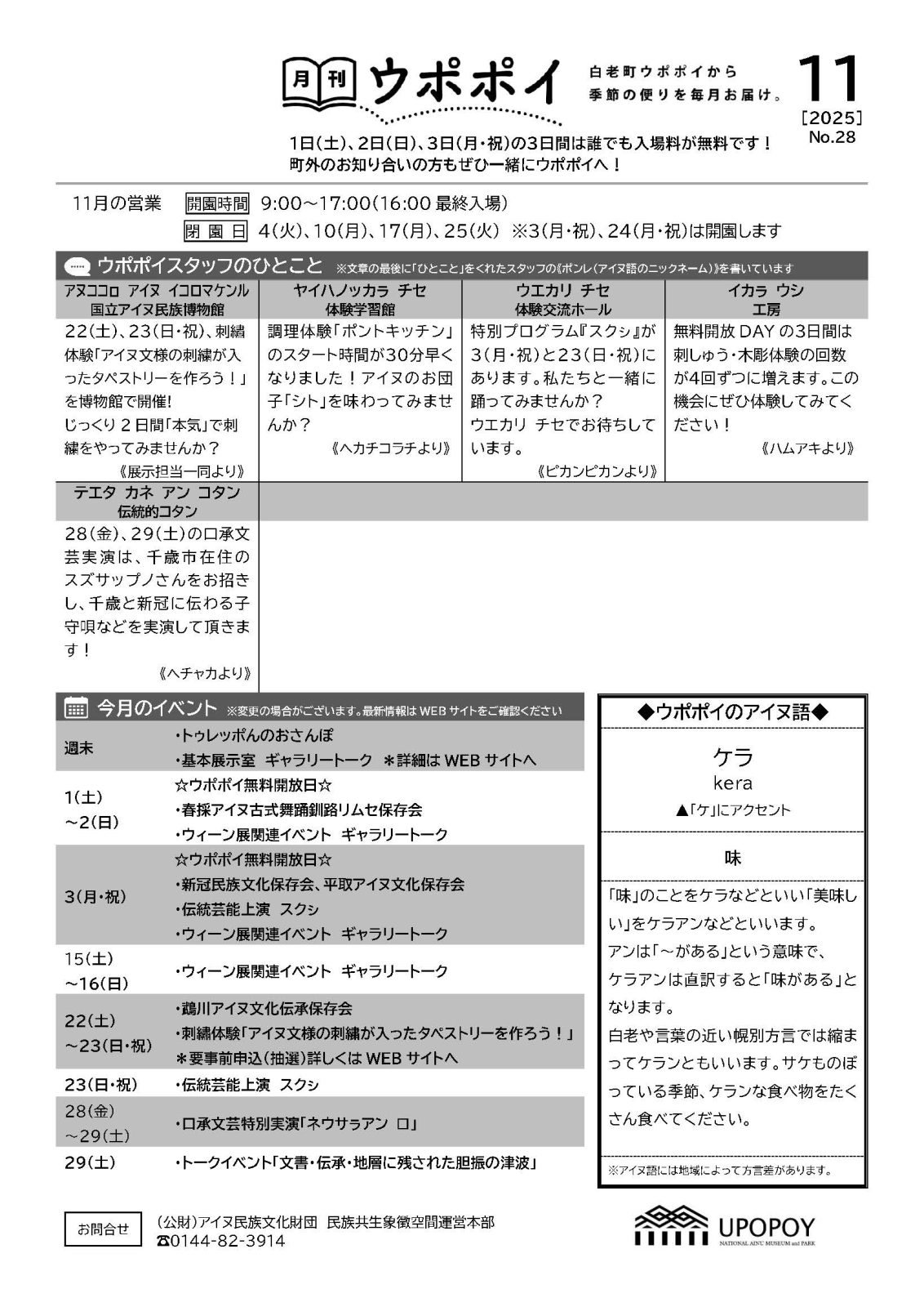 お知らせ 月刊ウポポイ 11月号【No.28】 公開日: 2025年11月18日 月刊ウポポイ 月刊ウポポイ11月号【No.28】(PDFファイル294KB) 前の記事へ 次の記事へ 一覧へ戻る 最近のお知らせ一覧 WEB購入限定のウポポイ入場券200円割引 ~4月1日以降も継続~ 2026年3月24日 令和8年度からアイヌ文化を体系的に学ぶ座学プログラム「ウポポイ大学」を新規開講 2026年3月17日 国立アイヌ民族博物館・国立歴史民俗博物館 共催「アイヌ民族と博覧会 ―150年の経験―」6月20日から開催決定 2026年3月12日 新たな飲食2店舗がオープン。アイヌ文化に触れる食体験を提供 2026年3月10日 学校会員制度「ウポポイキャンパスメンバーズ」を創設 会員校の学生・教職員はウポポイ入場料が無料に 2026年3月3日 アーカイブ 2026年 (23) 3月 (6) 2月 (9) 1月 (8) 2025年 (85) 12月 (8) 11月 (4) 10月 (7) 9月 (11) 8月 (6) 7月 (11) 6月 (9) 5月 (2) 4月 (8) 3月 (7) 2月 (6) 1月 (6) 2024年 (93) 12月 (18) 11月 (8) 10月 (13) 9月 (7) 8月 (5) 7月 (9) 6月 (6) 5月 (8) 4月 (2) 3月 (8) 2月 (4) 1月 (5) 2023年 (57) 12月 (8) 11月 (4) 10月 (8) 9月 (5) 8月 (10) 7月 (6) 6月 (5) 5月 (5) 4月 (2) 2月 (2) 1月 (2) 2022年 (51) 12月 (1) 11月 (2) 10月 (5) 9月 (8) 8月 (12) 7月 (6) 6月 (2) 5月 (3) 4月 (4) 3月 (3) 2月 (4) 1月 (1) 2021年 (11) 11月 (2) 10月 (2) 5月 (1) 4月 (2) 3月 (1) 2月 (3) 2020年 (14) 12月 (3) 11月 (3) 10月 (1) 9月 (1) 7月 (4) 6月 (1) 5月 (1) カテゴリー 月刊ウポポイ (32) プレスリリース (123) 募集 (28) お知らせ (126) 新型コロナウイルス感染症関連 (25)