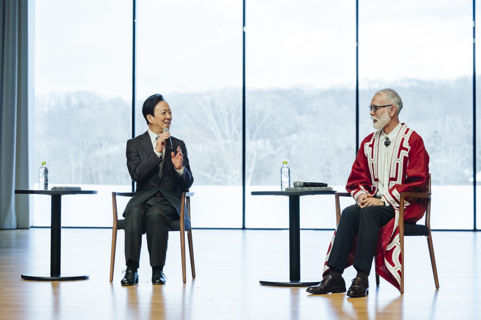 坂東玉三郎丈は、ウポポイ園内の冬景色を背景に、今回初めて訪れたウポポイの感想や歌舞伎とアイヌ文化の接点について紹介し、過去の豊かな文化交流に想いをはせる時間となりました。また、文化継承の現代的な難しさと、それゆえ日々一生懸命に取り組むことが革新へと結果的につながると語りました。今後の文化交流の可能性については、心を通じ合わせる場の重要性を伝え、多くの来場者がうなずきながら熱心に耳を傾けていました。