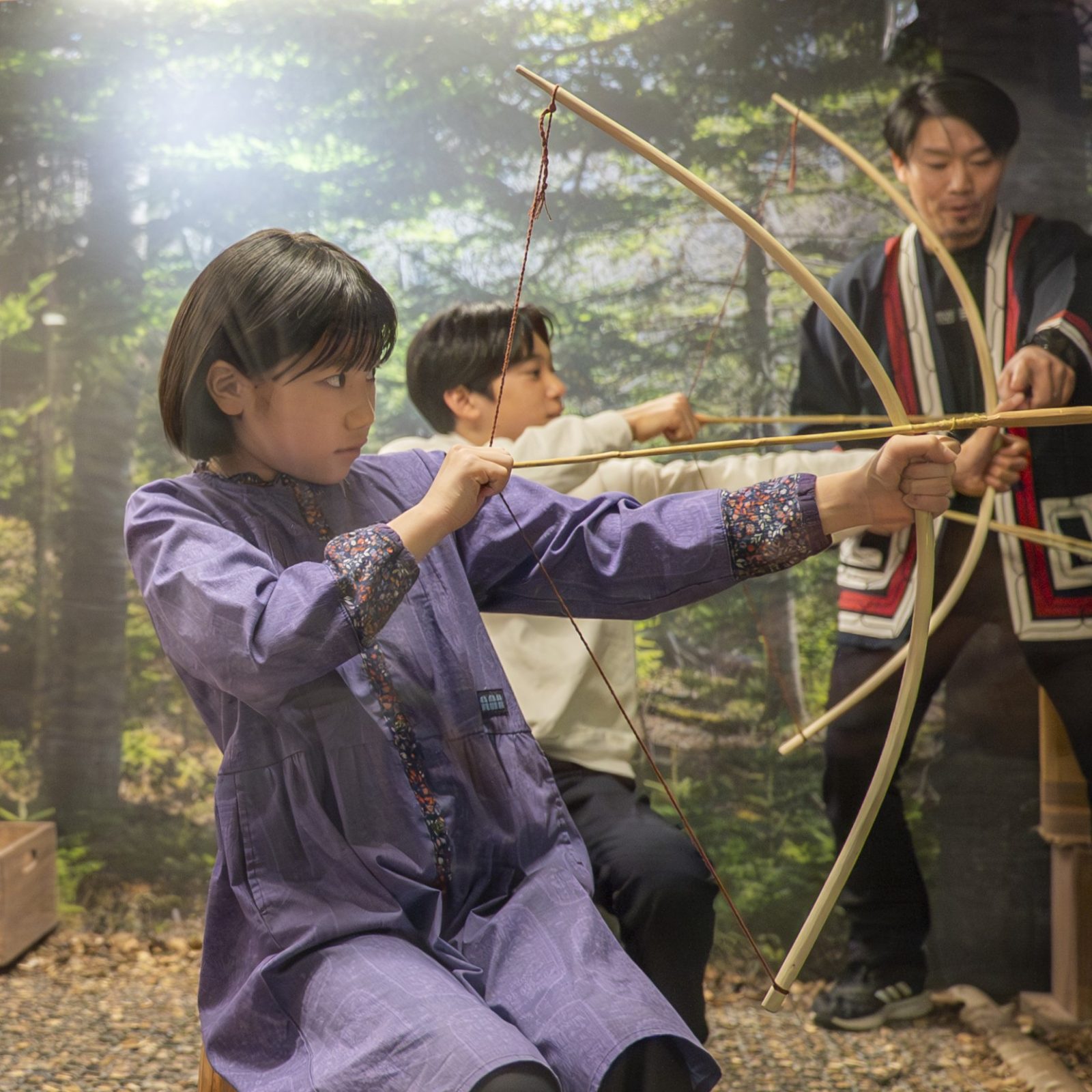 ウポポイのプログラム紹介のほか、観覧の方々も参加できる歌・踊りや伝統楽器ムックリの演奏体験、PRキャラクターのトゥレッポんが登場するアイヌ語でのリズム遊びなど、ウポポイスタッフとの交流を通じてアイヌ文化を体感できるスペシャルステージを開催。屋外では弓矢遊びも体験できます。