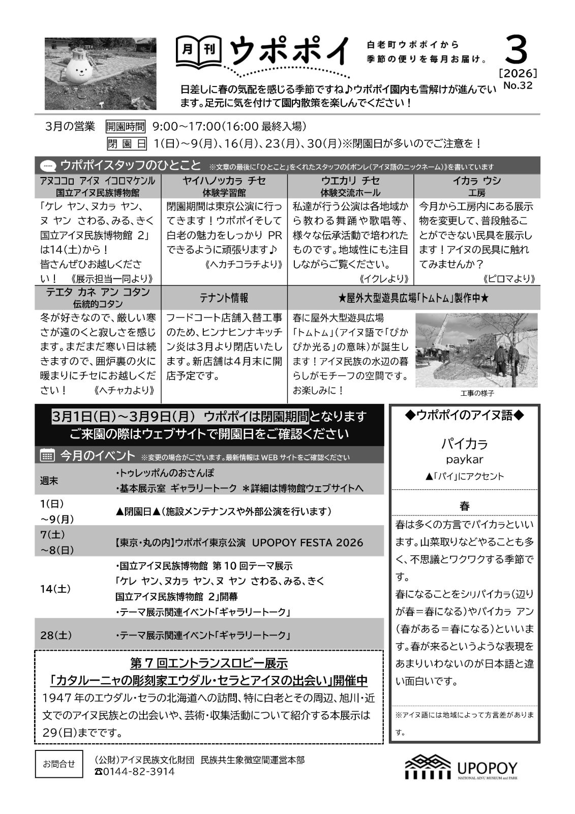 お知らせ 月刊ウポポイ 3月号【No.32】 公開日: 2026年3月1日 月刊ウポポイ 月刊ウポポイ3月号【No.32】(PDFファイル330KB) 前の記事へ 次の記事へ 一覧へ戻る 最近のお知らせ一覧 学校会員制度「ウポポイキャンパスメンバーズ」を創設 会員校の学生・教職員はウポポイ入場料が無料に 2026年3月3日 【ウポポイ】東京カメラ部タイアップ企画「ウポポイ・白老・登別フォトコンテスト2025」入賞作品が決定! 2026年2月26日 月刊ウポポイ 3月号【No.32】 2026年3月1日 国立アイヌ民族博物館にはじめて行く人のための支援ツール「あんしんガイド」を公開 2026年2月25日 東京・丸の内でアイヌ文化を体感、ウポポイを知るきっかけに 2026年2月20日 アーカイブ 2026年 (19) 3月 (2) 2月 (9) 1月 (8) 2025年 (85) 12月 (8) 11月 (4) 10月 (7) 9月 (11) 8月 (6) 7月 (11) 6月 (9) 5月 (2) 4月 (8) 3月 (7) 2月 (6) 1月 (6) 2024年 (93) 12月 (18) 11月 (8) 10月 (13) 9月 (7) 8月 (5) 7月 (9) 6月 (6) 5月 (8) 4月 (2) 3月 (8) 2月 (4) 1月 (5) 2023年 (57) 12月 (8) 11月 (4) 10月 (8) 9月 (5) 8月 (10) 7月 (6) 6月 (5) 5月 (5) 4月 (2) 2月 (2) 1月 (2) 2022年 (51) 12月 (1) 11月 (2) 10月 (5) 9月 (8) 8月 (12) 7月 (6) 6月 (2) 5月 (3) 4月 (4) 3月 (3) 2月 (4) 1月 (1) 2021年 (11) 11月 (2) 10月 (2) 5月 (1) 4月 (2) 3月 (1) 2月 (3) 2020年 (14) 12月 (3) 11月 (3) 10月 (1) 9月 (1) 7月 (4) 6月 (1) 5月 (1) カテゴリー 月刊ウポポイ (32) プレスリリース (118) 募集 (28) お知らせ (127) 新型コロナウイルス感染症関連 (25)