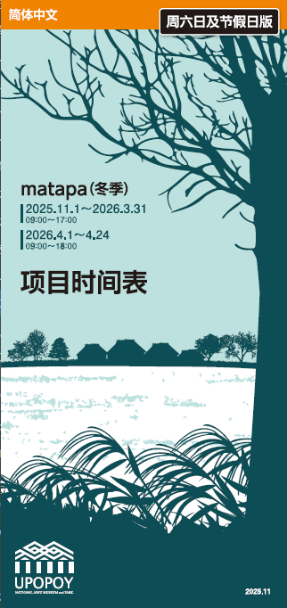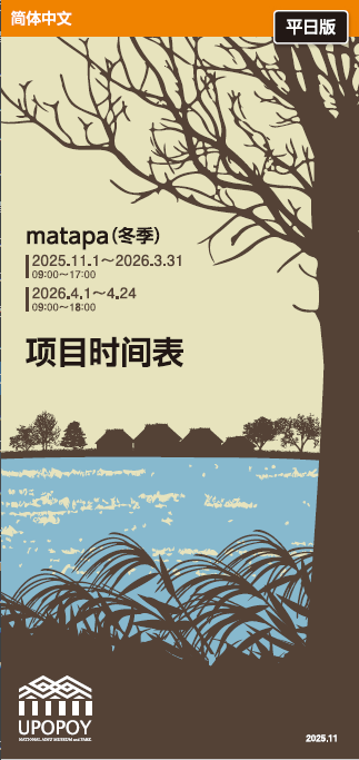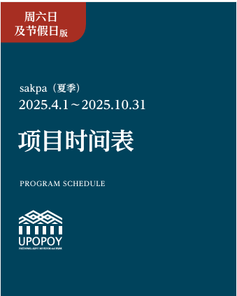 下载宣传材料 UPOPOY宣传册及资料 Pamphlet (PDF file 7MB) Map(2025.4〜2026.3) (PDF file 8MB) 项目时间表 项目时间表平日版2025.11.1~2026.4.24 (PDF file 4MB) 项目时间表周六日及节假日版2025.11.1~2026.4.24 (PDF file 4MB) 体验交流大厅项目 ”Sinot” ”Imeru” ”Inomi" (PDF file 4MB) The Boy Who Brought Down a Kamuy (PDF file 617KB) The Solar Deity Caught by Evil Fox (PDF file 515KB)