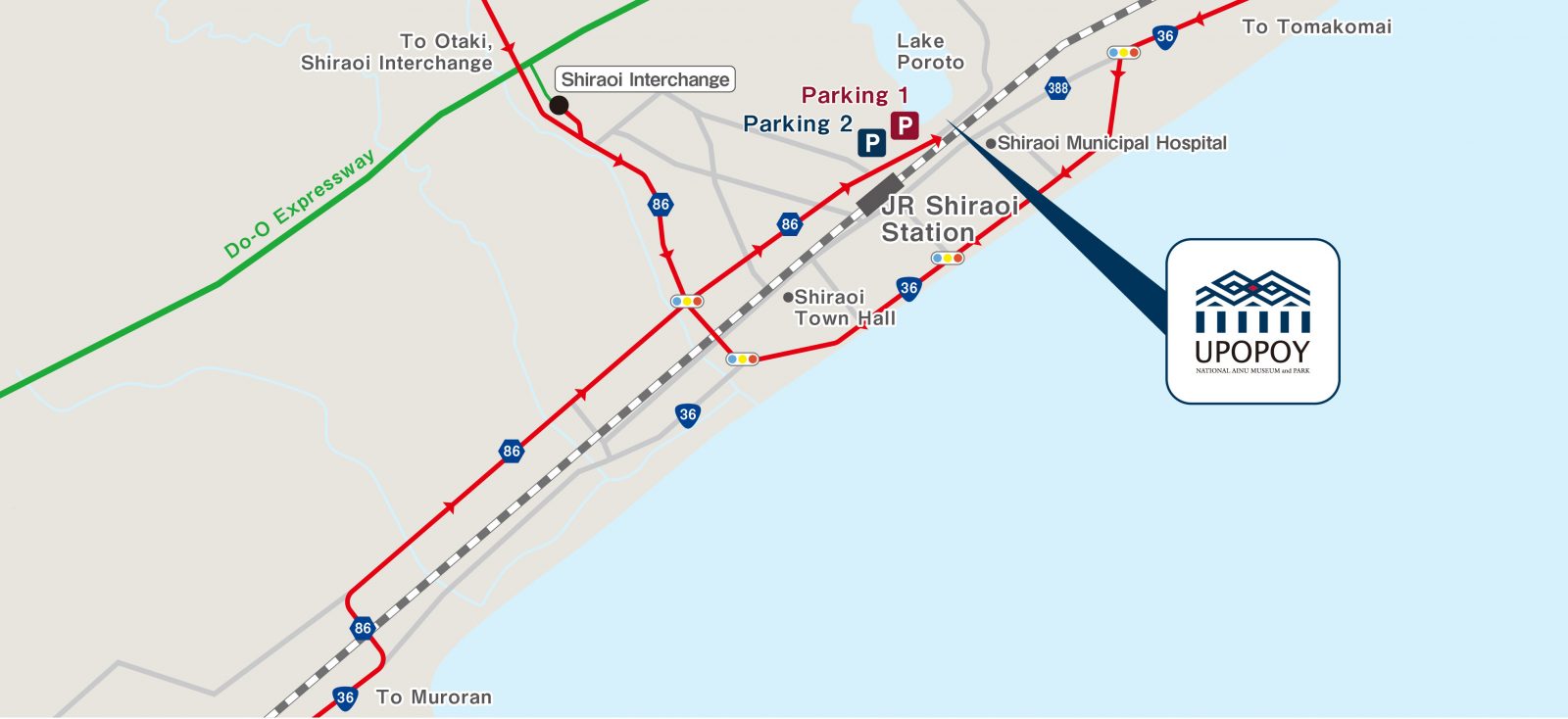 Follow road signs for Upopoy to get from Route 36 or Route 86 to Parking 1 along the route indicated by the red arrows in the diagram above. To ensure the smooth flow of traffic, please enter the parking lot by turning left.Turning right into the parking lot is not possible during peak traffic periods.