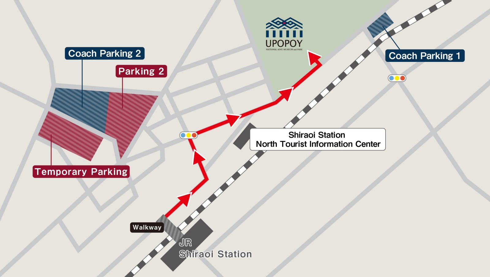 Visitors may be directed to Temporary Parking, located about 0.5 km from Upopoy, in order to ease congestion on the surrounding roads or when Parking 1 is full during busy periods such as Golden Week. Please follow any directions from members of staff.