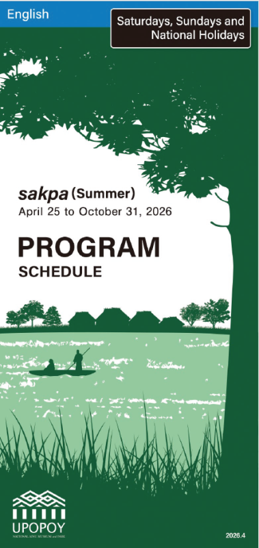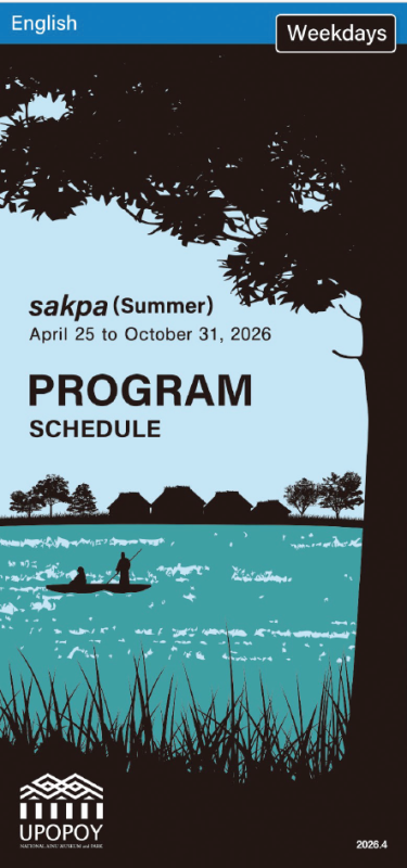 Promotional Download Library Upopoy Pamphlets Pamphlet (PDF file 2MB) Map(Apr.2026ーMar.2027) (PDF file 3MB) Program Schedules PROGRAM SCHEDULEWeekdaysNov. 1, 2026 to Apr. 24 (PDF file 15MB) PROGRAM SCHEDULESaturdays, Sundays and National HolidaysNov. 1, 2025 to Apr. 24 (PDF file 15MB) PROGRAM SCHEDULEWeekdaysApril 25 to October 31, 2026 (PDF file 3MB) PROGRAM SCHEDULESaturdays, Sundays and National HolidaysApril 25 to October 31, 2026 (PDF file 3MB) Cultural Exchange Hall Programs ”Sinot” ”Imeru” ”Inomi" (PDF file 4MB) The Boy Who Brought Down a Kamuy (PDF file 617KB) The Solar Deity Caught by Evil Fox (PDF file 515KB)