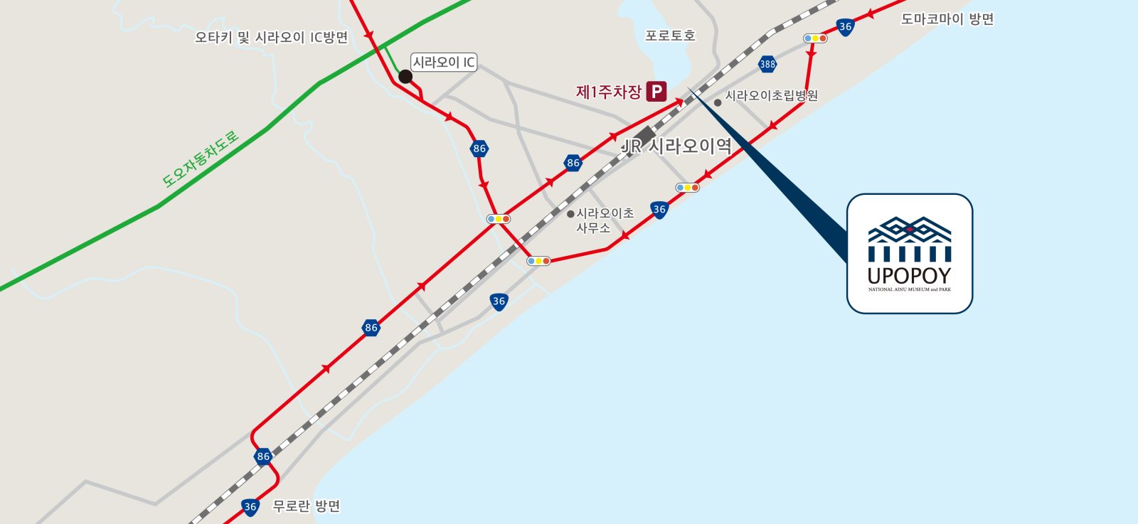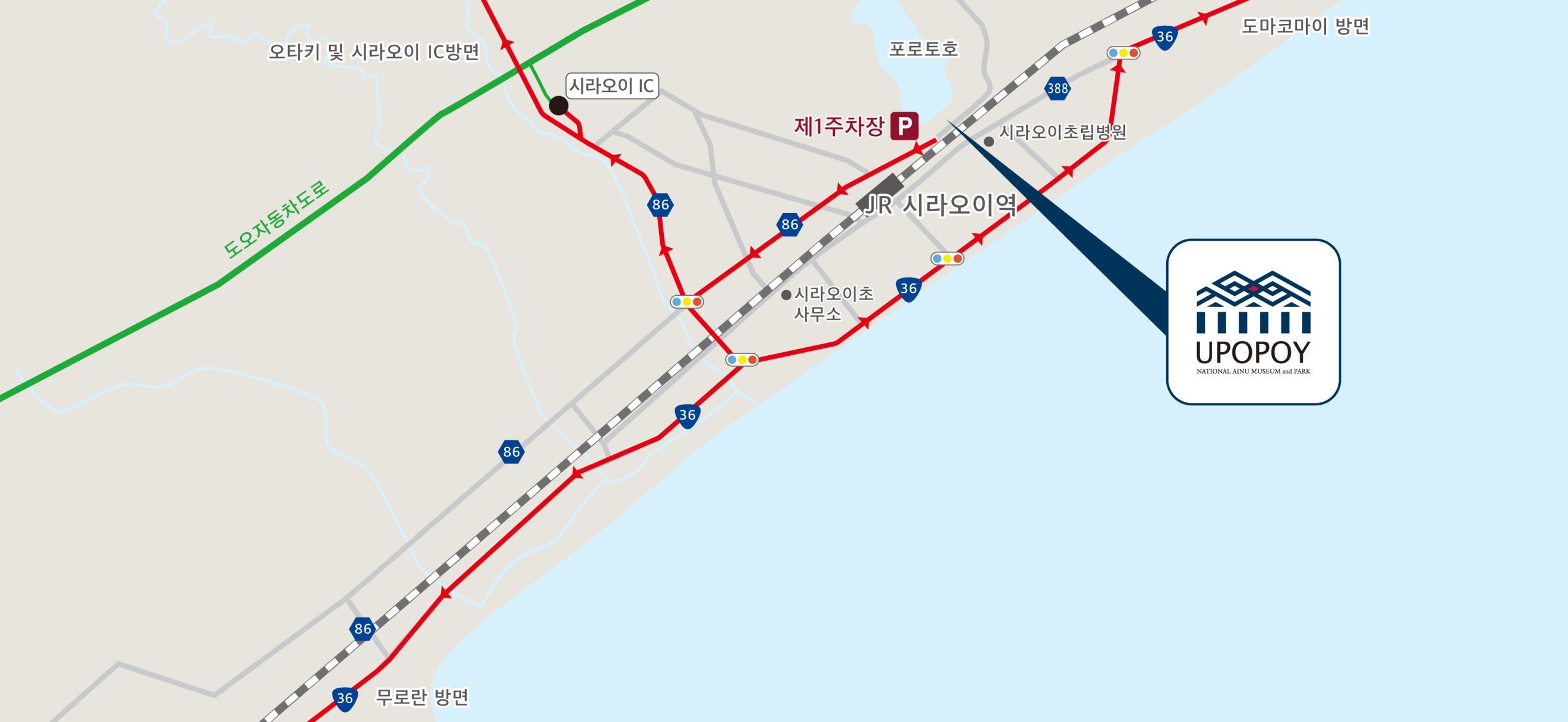 국도 또는 도도(道道) 이용 시 우회 경로(교통 표지판대로 진행하십시오. 위 그림의 빨간색 화살표대로)로 제1주차장까지 가서 좌회전하여 주차장에 진입하십시오.봄철 대형연휴 등 성수기에는 주변 도로와 제1주차장이 혼잡하여 약 0.5km 떨어진 임시주차장으로 안내될 수 있습니다. 안내원의 지시에 따라 이동해 주시기 바랍니다.
