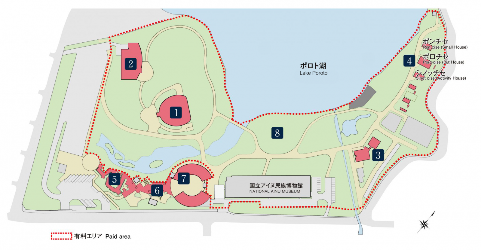 매표소, 안내 센터, 휴게소 외에, 아이누 공예품과 같은 선물 등을 제공하는 숍이 있습니다. 또, 창 너머로 펼쳐지는 조망을 즐길 수 있는 레스토랑과 폭넓은 메뉴를 제공하는 푸드 코트도 있어서 아이누의 식문화를 즐길 수도 있습니다.