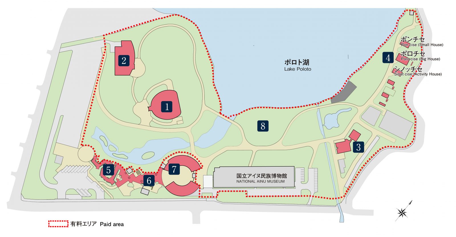В этой части находятся билетные кассы, информационный отдел, место для отдыха и магазины, в которых можно приобрести товары народного промысла айну. Здесь также расположен ресторан с панорамными окнами, из которых открывается захватывающий вид и ресторанный дворик, в котором нашим посетителям предложат широкий выбор блюд для знакомства с кулинарными традициями айну.