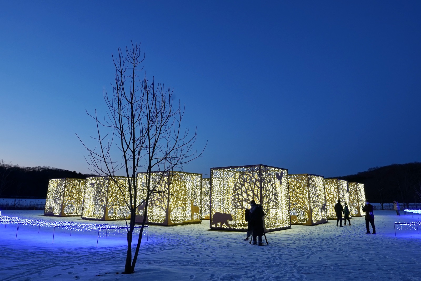 アイヌ文化にゆかりのある動物たちをブロック型のイルミネーションが鮮やかに彩ります。