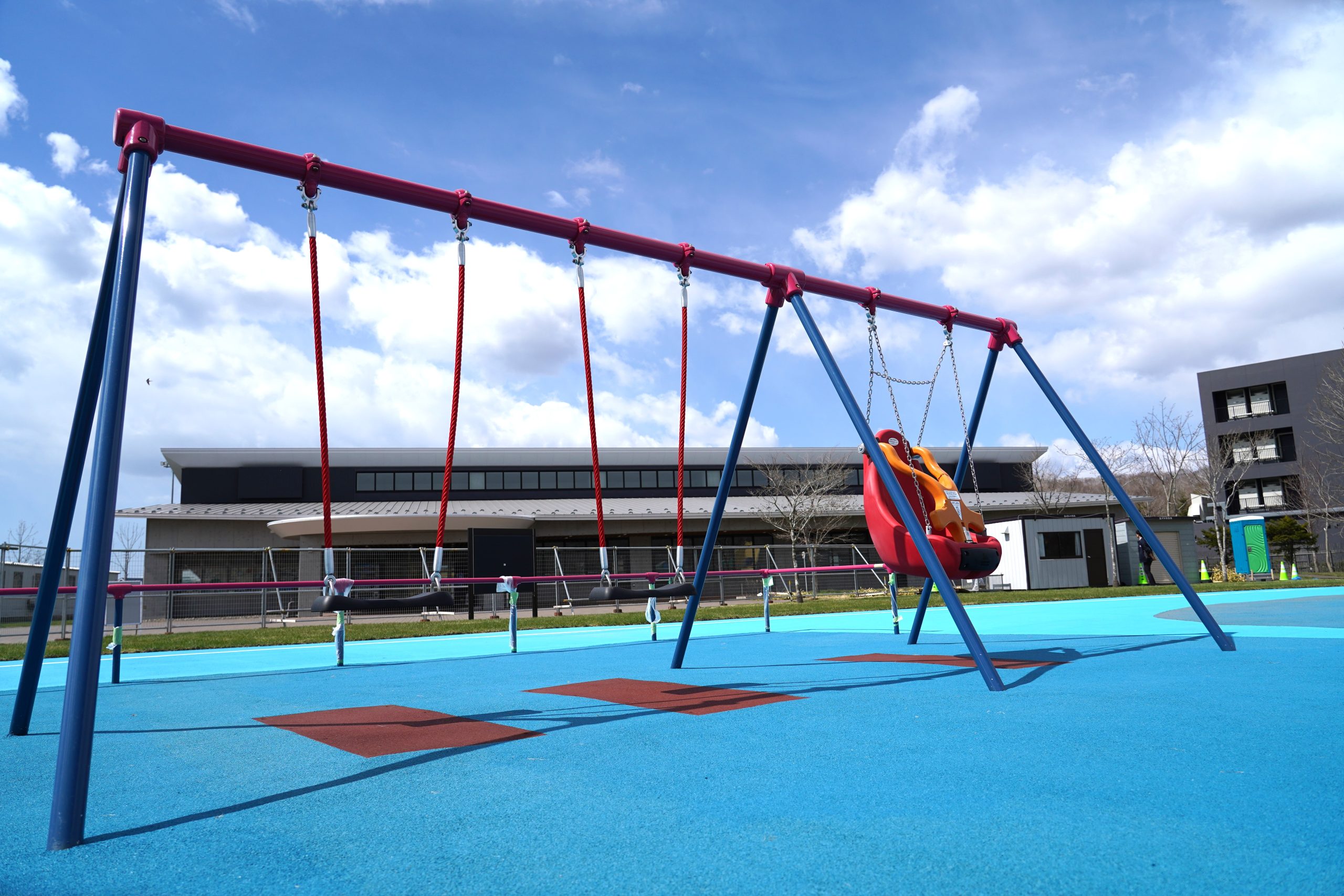 3つの座面のうち、1つがサポート付きシートとなっており、サポート付きシートを備えたブランコで、体幹の保持が難しいお子さまも安心して楽しむことができます。