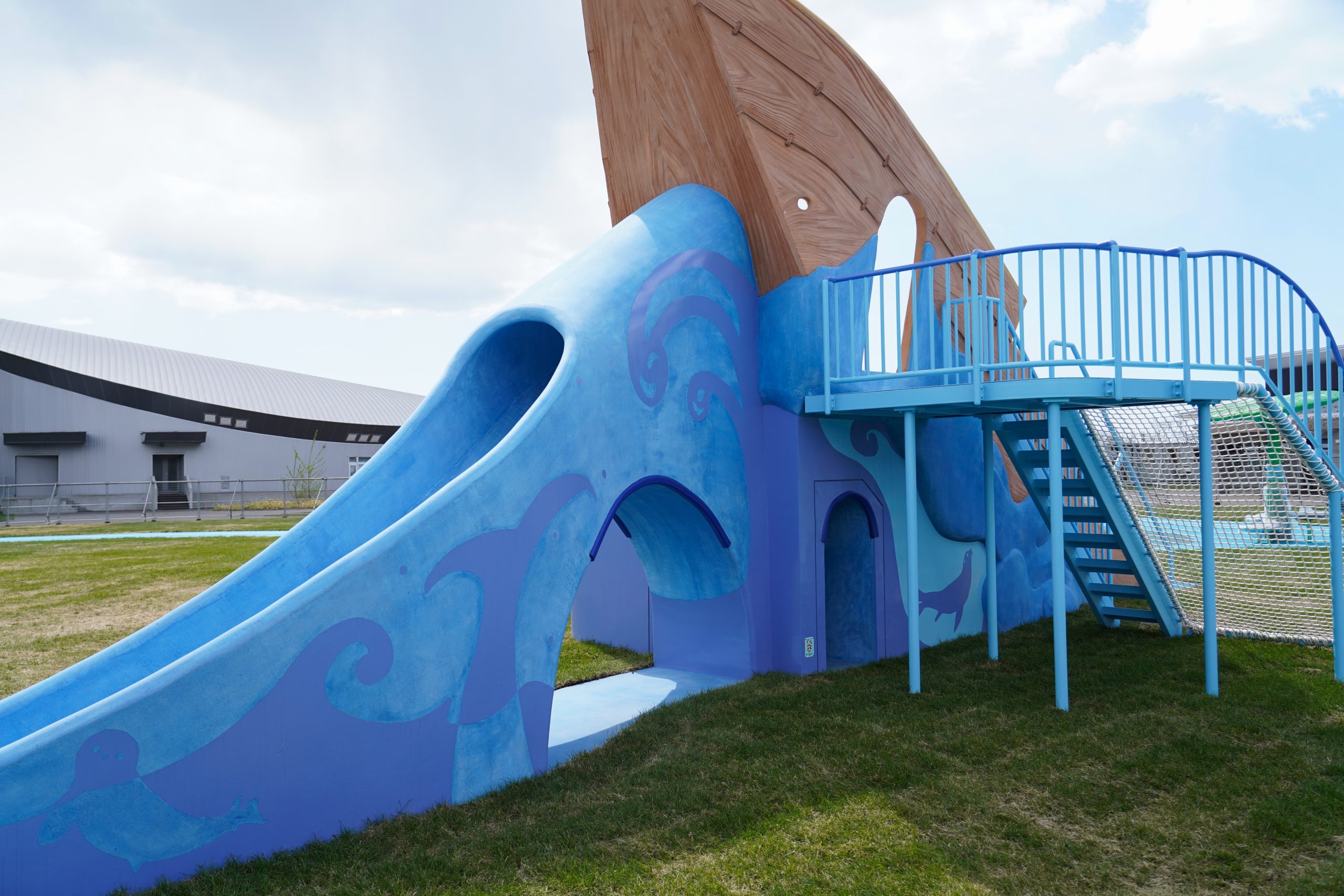 屋外大型遊具広場「トㇺトㇺ」は、アイヌ語で「ぴかぴか光る」の意味です。小さな子どもも、車椅子利用の子どもも一緒に遊べるユニバーサル設計の遊具です。アイヌ民族の伝統的な生活空間、水辺の暮らしにおける「漁」がモチーフになっています。ダイナミックな波を感じながら、海の生きものたちと出会える、ワクワクいっぱいの空間が広がります。